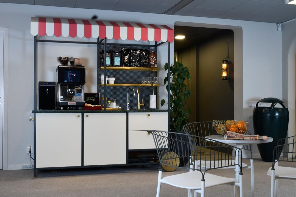 Mässing och marmor blandat med en lackad stålram och perforerad plåt i klövermönster gör ett lyxigt intryck. Denna eleganta cafévagn står uppställd på ett kontor i Stockholms City.