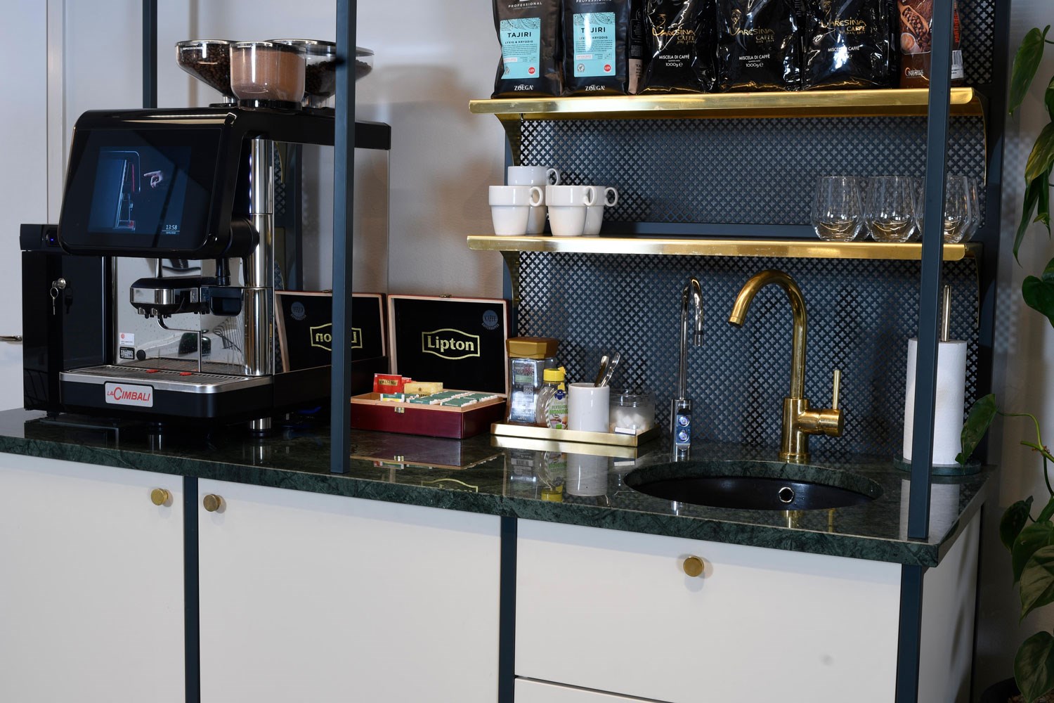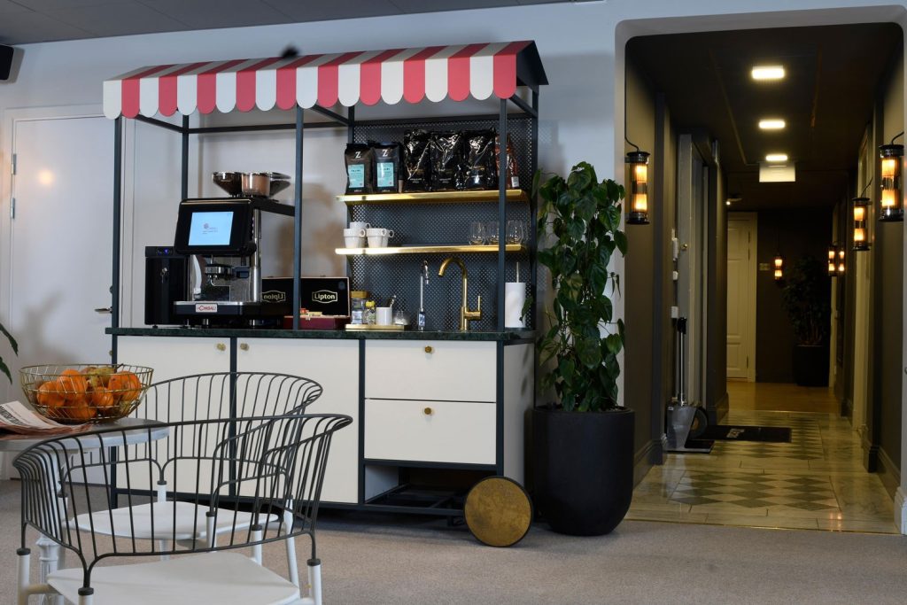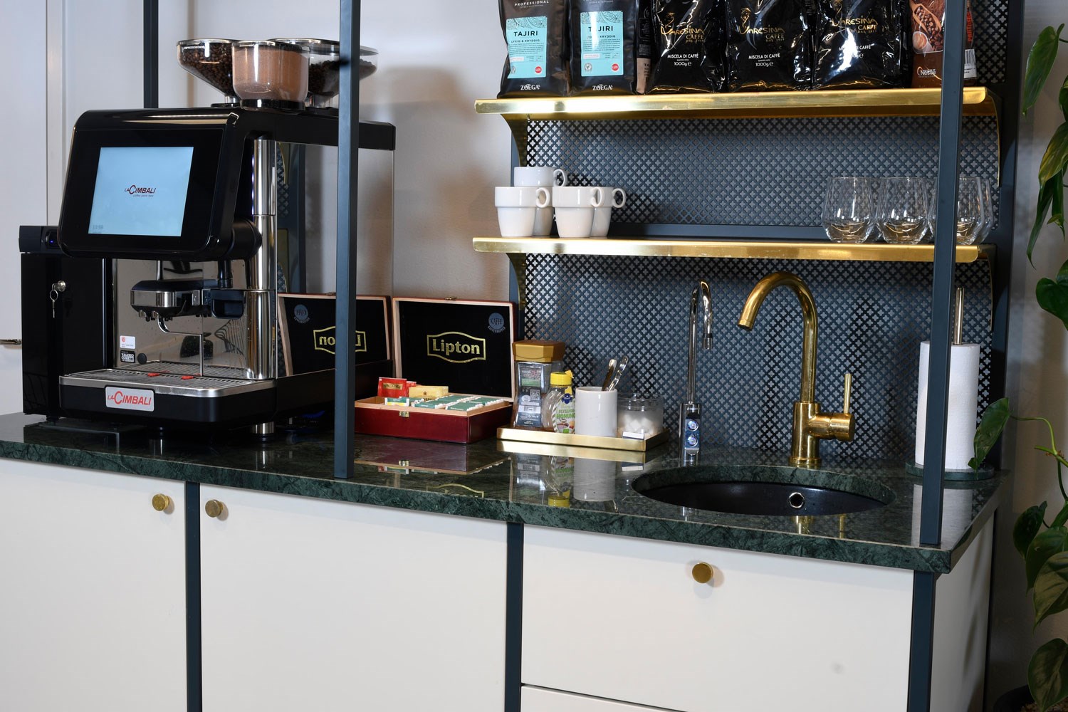 Mässing och marmor blandat med en lackad stålram och perforerad plåt i klövermönster gör ett lyxigt intryck. Denna eleganta cafévagn står uppställd på ett kontor i Stockholms City.