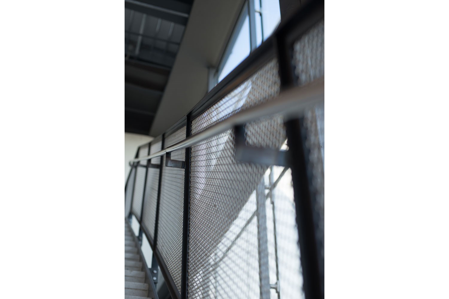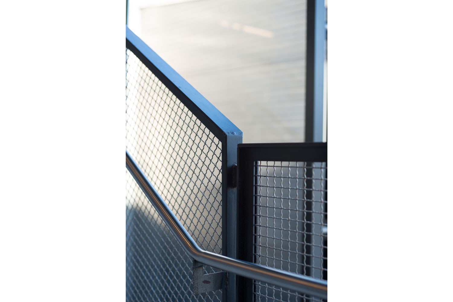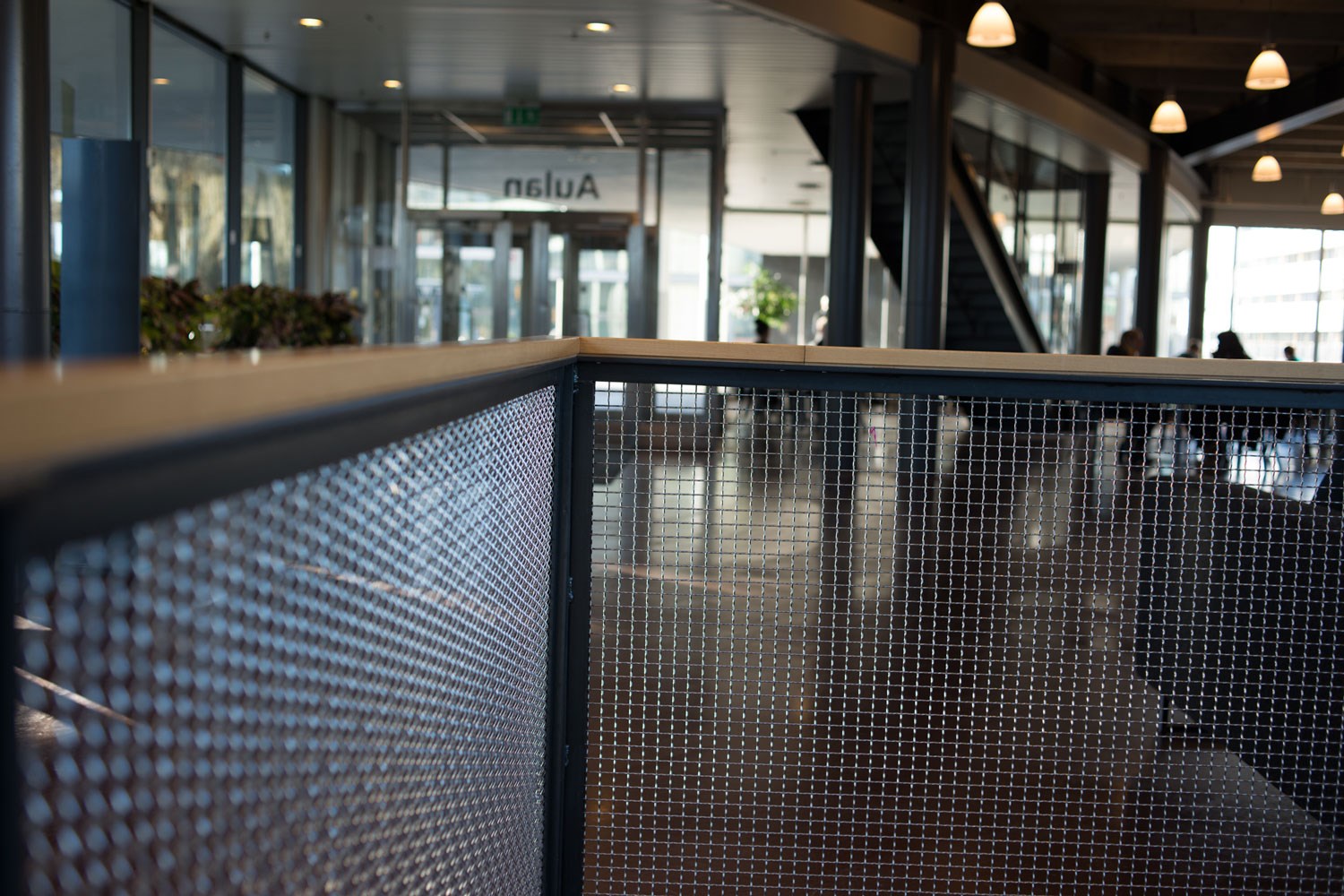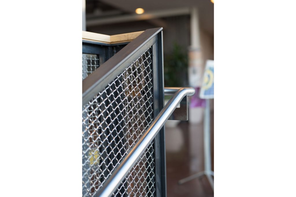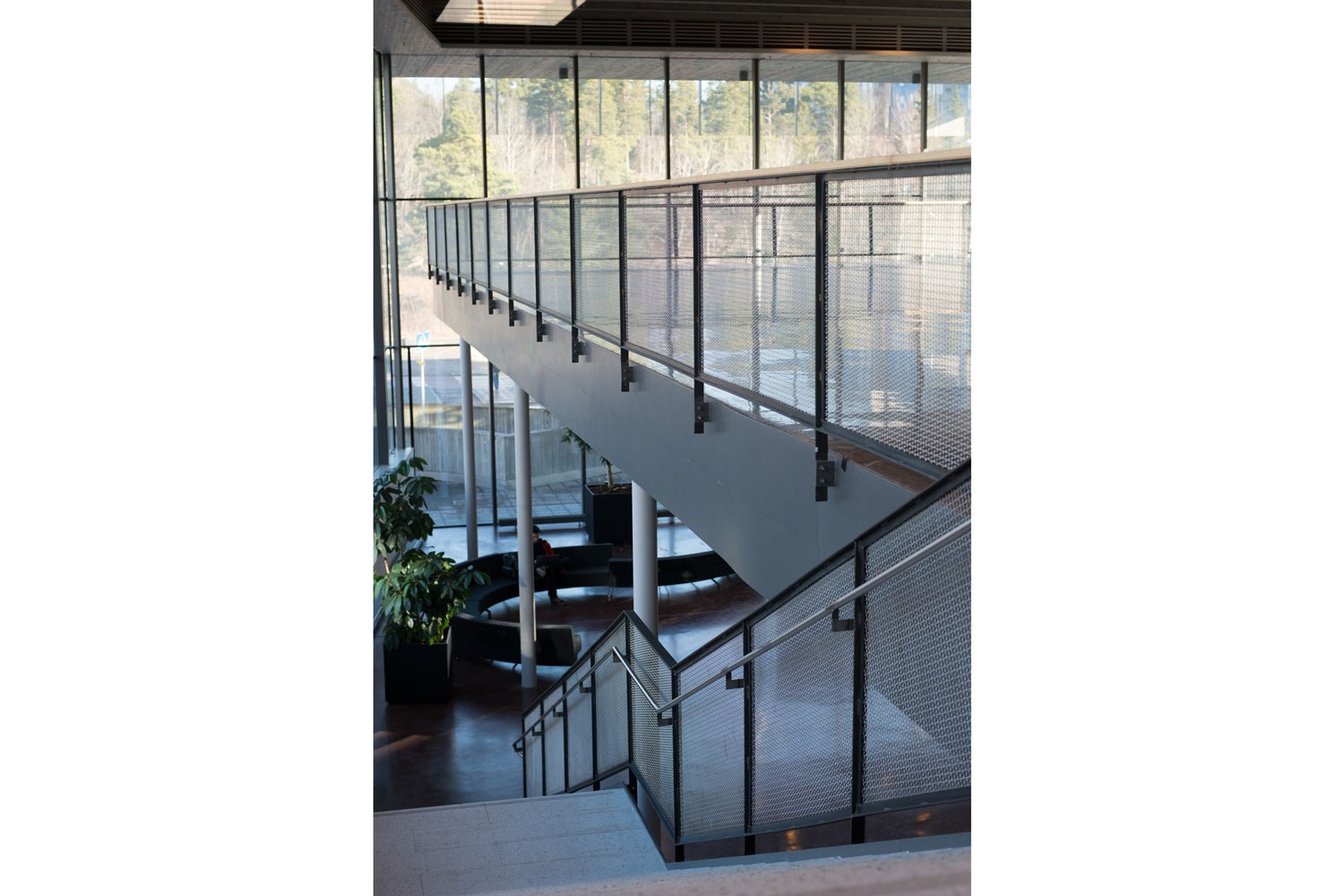 Trappräcke med krenelerat galler är också snygg att titta på. En kombination av säkerhet och skönhet. Ett beständigt och stiligt räckesystem med hög insynsskyddsfaktor. Detta trappräcke av krenelerat galler sitter i Södertörn högskola i Huddinge.