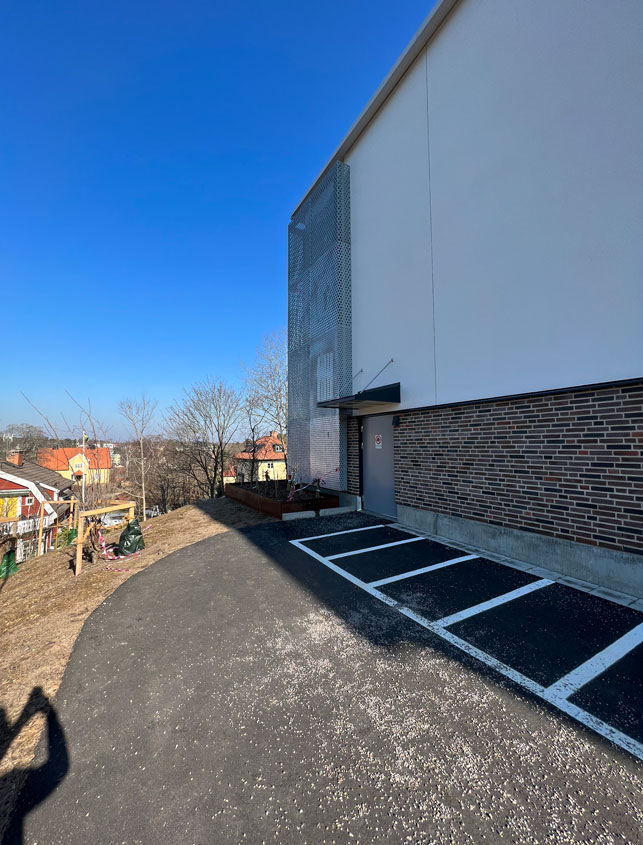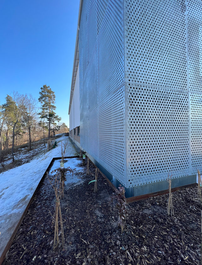 Fasadbeklädnad av perforerad plåt kan liva upp en byggnad både in- och utvändigt. Plåten kan väcka liv i gamla skamfilade hus. En fasad av perforerad plåt öppnar oanade möjligheter för arkitekter som älskar att experimentera. Låt dig överraskas! I detta projekt med två olika runda hål storlekar ger plåten nya visuella intryck. Det har vi utnyttjat. Denna fasadbeklädnad av perforerad plåt sitter i en skola på Lidingö
